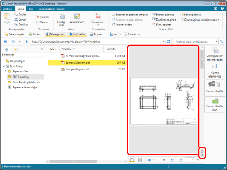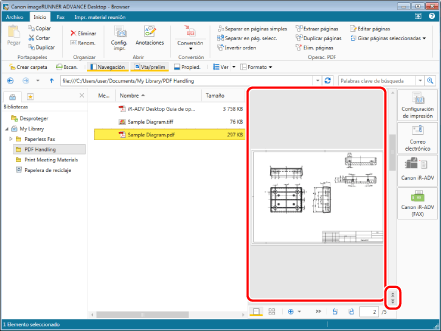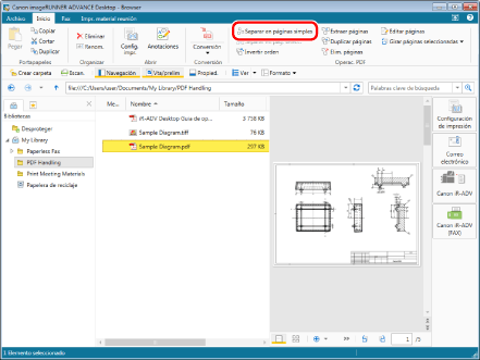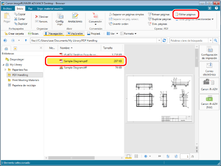 Seleccione el archivo "Sample Diagram.pdf" que creó en "Convertir en un documento PDF" y, a continuación, haga clic en [Editar páginas] en la pestaña [Inicio]. Se iniciará el Modo de edición de páginas.