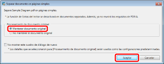 Confirme que se haya seleccionado [Mantener documento original] y haga clic en [Aceptar]. El documento PDF se divide en páginas individuales y se guarda en la misma ubicación.