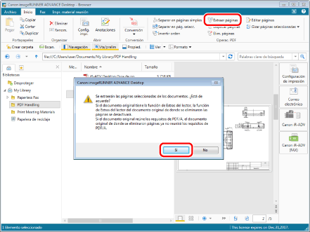 Haga clic en [Extraer páginas] en la pestaña [Inicio] y, a continuación, haga clic en [Si] en el cuadro de diálogo que aparece. La página extraída se guarda en la misma ubicación.