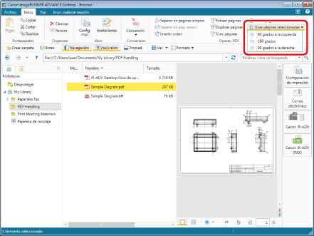Haga clic en [Girar páginas seleccionadas] en la pestaña [Inicio] y seleccione [90 grados a la izquierda], [180 grados] o [90 grados a la derecha].