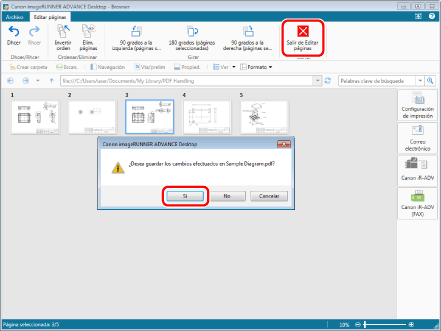 Haga clic en [Salir de Editar páginas] en la pestaña [Editar páginas] y, a continuación, haga clic en [Sí] en el cuadro de diálogo que se muestra. El documento se guardará.