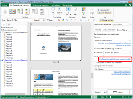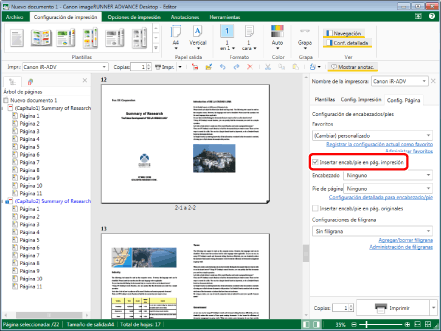 En la pestaña [Config. Página] de la Ventana Detalles, seleccione la casilla de verificación [Insertar encab/pie en pág. impresión].