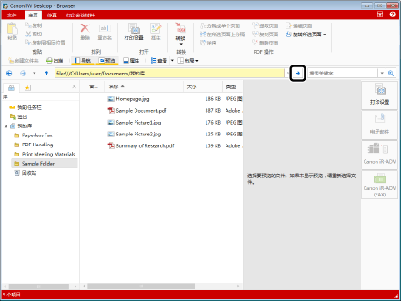 在地址栏中输入文档路径时,将显示在导航窗口中存储文档的文件夹。在文件列表视图窗口中选择文档,然后会启动与文档关联的应用程序并显示文档。