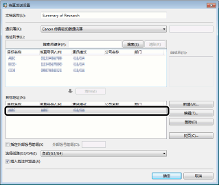 如果传真驱动程序不支持G3/G4,传真号码将显示在[目标名称]中,而[传真类型]和[通讯模式]则变为空白。可在[目标地址]中选择地址后单击[编辑]以更正。