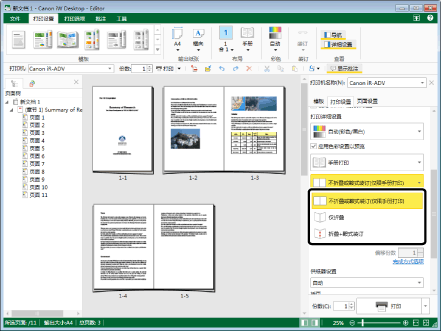 将文档分割成在 [每集页数] 中设置的页数,并执行手册打印。
