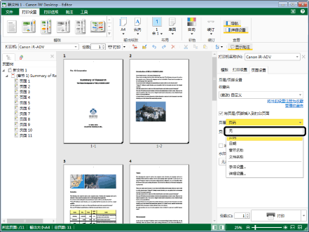 从详情窗口上[页面设置]选项卡的[页眉/页脚设置]中的每个[页眉]/[页脚]下拉列表中选择[字体设置]