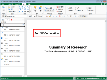 当批注隐藏时,无法从导航窗口的[批注列表]选项卡搜索批注。有关如何显示/搜索批注的信息,请参阅下列内容。