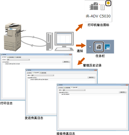 Printer Monitor 也可用于监视打印作业状态,并管理打印机日志和传真传送/接收日志。