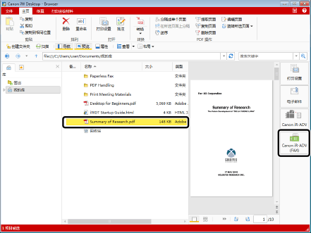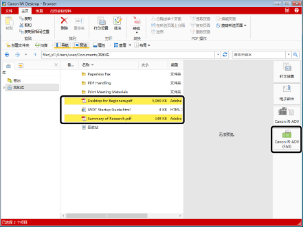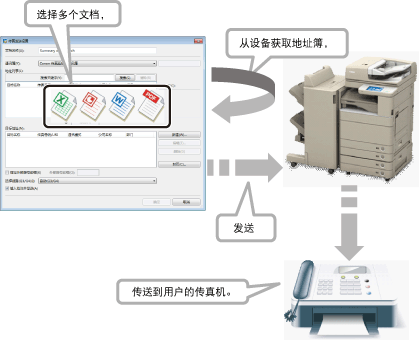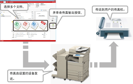 要将多个文档作为单个文档传真,需在传真输出按钮设置中设置 [用 Editor 将所选文档合并为一个以发送传真]。有关如何设置这些设置的信息,请参阅下列内容。