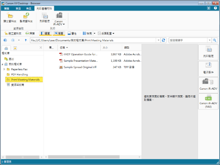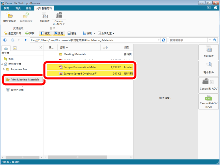 選取「Print Meeting Materials」資料夾,在按下鍵盤上的「Shift」鍵的同時選取「Sample Presentation Materials.pdf」和「Sample Spread Original.tiff」。