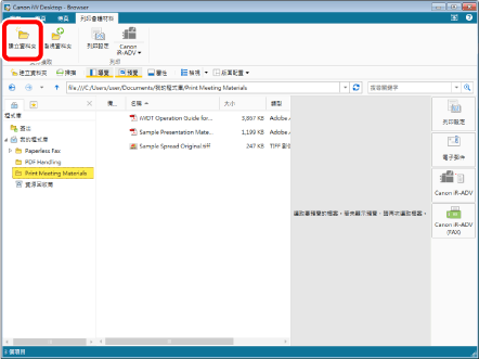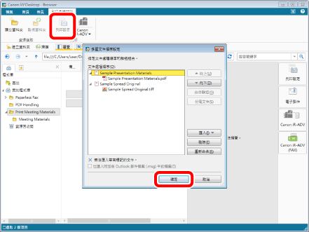 例如,貴公司每個月都會召開例行會議。因為這些會議需要用到各種資料,因此必須收集並列印這些資料。透過使用安裝 Desktop 時註冊的「列印會議材料」標籤,您可有效率地準備這些資料。「列印會議材料」標籤會透過列印工作專用的功能進行設定。