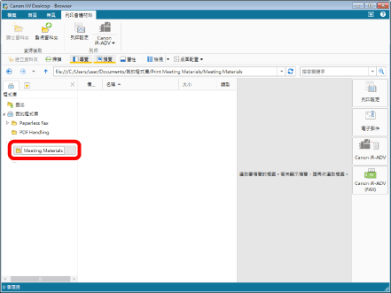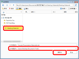 選取「Meeting Materials」資料夾,確定「文件類型」顯示為「Canon Desktop Document (*.iwb)」,然後按一下「儲存」。