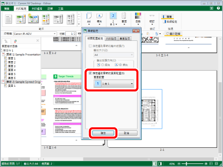 在顯示的對話方塊中選取「指定選取章節的頁面配置」核取方塊,接著在「頁面配置」中選取1 合 1」,然後按一下「確定」。