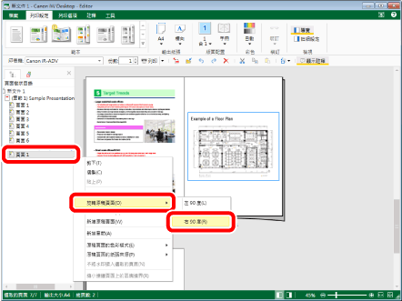 在 頁面樹狀目錄 中,選取 (章節 2) Sample Spread Original 的 頁面 1,然後以滑鼠右鍵按一下並選取「旋轉原稿頁面」>「右 90 度」。