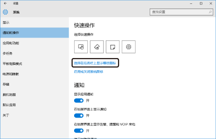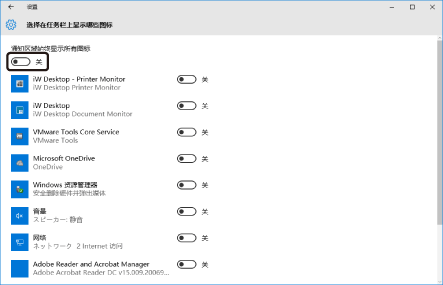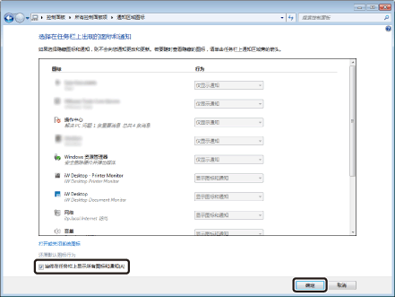 即使将以下图标设置从[关]更改为[开],Printer Monitor和Document Monitor图标也可以显示在任务栏的通知区域。