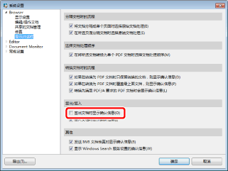 [系统设置] > [Browser] > [显示对话框] > [签入文档时显示确认信息]
