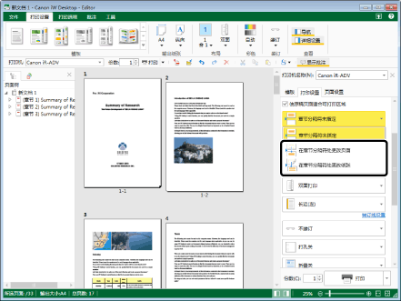 如果在详情窗口、功能区命令或工具按钮中的[打印设置]选项卡上取消选中[使用 Editor 的打印设置]复选框,则无法使用[在章节分隔符处更改纸张]。