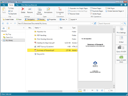 Documents in libraries can be printed, sent by fax, sent by e-mail, and edited from the Desktop Browser screen. Since folders in a library and external devices such as imageRUNNER ADVANCE can be monitored, the status of documents that have been added or updated and the status of external devices can be checked in the Desktop Browser screen.