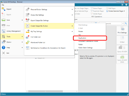 Select the [File] menu > [Tools] > [Create Output Bar Button] > [Application].