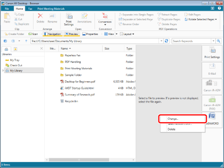 for the application output button displayed on the ribbon or toolbar and selecting [Change]. If an output button is not displayed on the ribbon or toolbar, see the following to display one. |