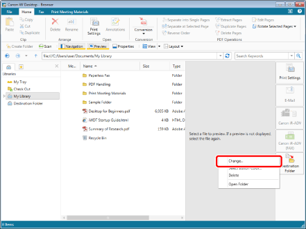 Click for the Document Destination Folder displayed on the ribbon or toolbar, and select [Change]