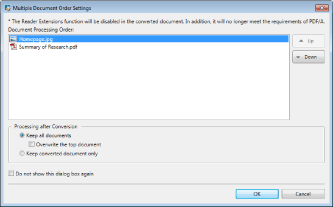 The [Multiple Document Order Settings] dialog box is displayed when the [Select document processing order when converting selected documents to a single PDF document] check box is selected.