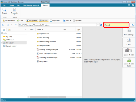 The path of the search target library or folder is displayed in [Search Location] on the Search Screen.