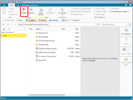 The search condition is deleted, and the [Search Conditions] list in the Navigation Window and the (Frequently Used Searches) pull-down list on the Search Screen are updated.