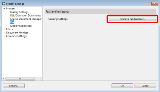 [System Settings] > [Browser] > [Fax] > [Retrieve Fax Number]