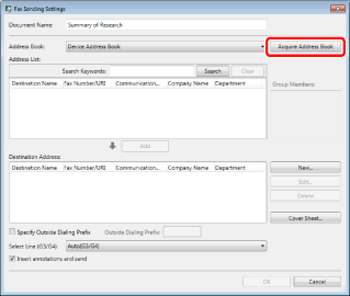 To retrieve addresses for the IP fax function from the address book of an imageRUNNER ADVANCE device, version 3.1.0 or later of Desktop Communicator must be installed in the imageRUNNER ADVANCE device. With version 3.0.0 or earlier, only the destination names are retrieved.