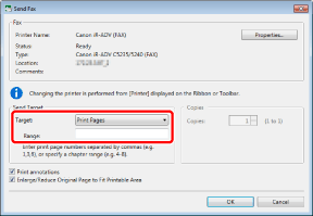 If the [Display print/send fax dialog] check box is selected, the [Send Fax] dialog box is displayed. For more information on using the [Send Fax] dialog box to send documents via fax, see the following.
