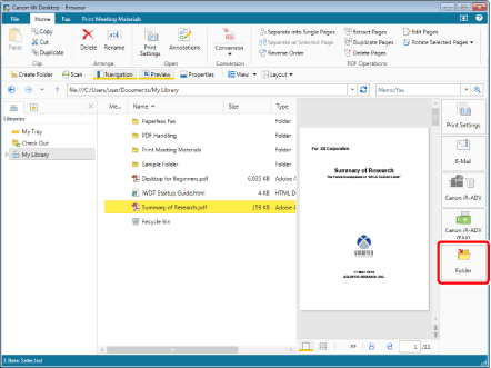 When [Move] is specified for [Document Operations] in the settings of the destination tray output button, the sent document is deleted from Desktop. To keep the sent document on Desktop, specify [Copy]. For more information on how to configure destination tray output buttons, see the following.