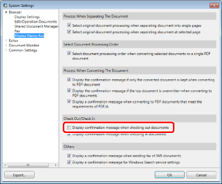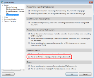 [System Settings] > [Browser] > [Display Dialog Box] > [Display confirmation message when checking in documents]