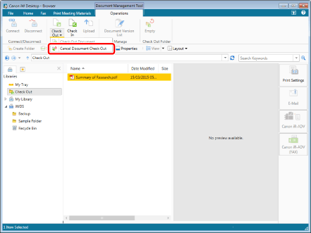 Canceling check out enables you to cancel the checked out status of a document and to restore the status of the document that was stored in a Document Server Library before the document is checked out.