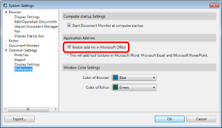 Select the [Enable add-ins in Microsoft Office] check box in [System Settings] > [Common Settings] > [Preferences], and click [OK].