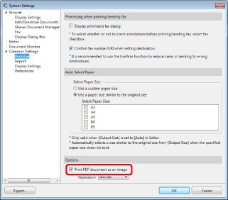 If the [Print PDF document as an image] check box is selected, all PDF documents are printed/faxed as images. Deselect the check box to print/fax them as PDF documents again.
