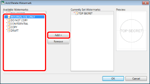 To delete a watermark, select the watermark to delete in [Currently Set Watermarks] and click [Remove].