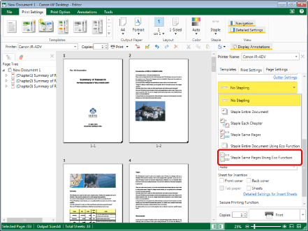 Select [Staple Same Pages Using Eco Function] in [Detailed Settings for Printing] on the [Print Settings] tab on the Details Window.