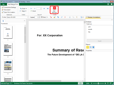When opening an IWB document in which information for connecting to a database is stored, starting the Mail Merge Print Settings Mode causes the database to be automatically connected to and the Mail Merge data to be updated.