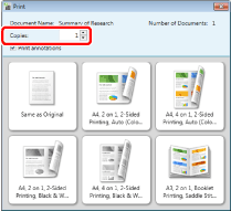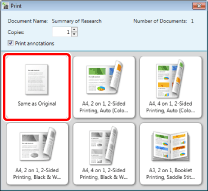 The [Printing] dialog box or the [Print] dialog box of the application used to create the document may be displayed. In this case, select [Desktop Document Writer] as the output printer and print.
