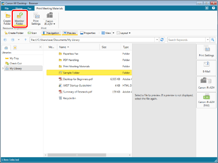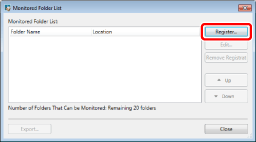 You can set up to 20 folders as monitoring targets. The transfer source folders set in My Tray or a Hot Folder here are not included in the upper limit on the number of folders to monitor.