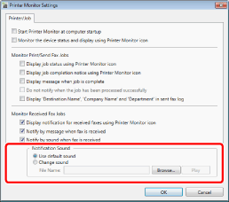 When [Change sound] is selected, the sound file specified for [File Name] is set as the notification sound. The wav/wave format sound files selected by clicking [Browse] are displayed in [File Name] and can be specified as the notification sound.