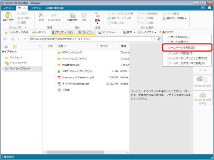 ツールバーからボタンをすべて削除した場合、ツールバーは非表示になります。