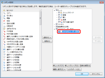 [リボンの設定]ダイアログボックスの左側の一覧から選択して、リボンに追加したグループには、コマンドを追加できません。