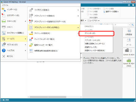 Windowsのプリンターのプロパティー画面でプリンターアウトプットボタンに登録されているプリンターのプリンター名を変更した場合、プリンターアウトプットボタンを使用した印刷ができなくなります。プリンター名を変更した場合は、プリンターアウトプットボタンの設定でプリンターを選択し直してください。