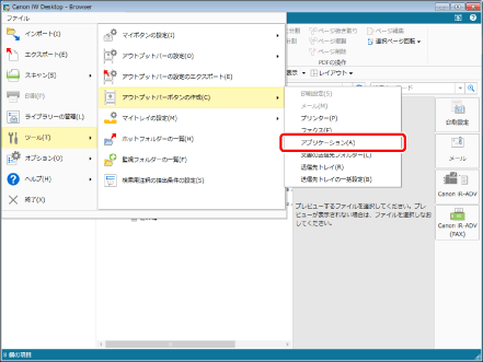 [ファイル]メニュー > [ツール] > [アウトプットバーボタンの作成] > [アプリケーション]を選択します。