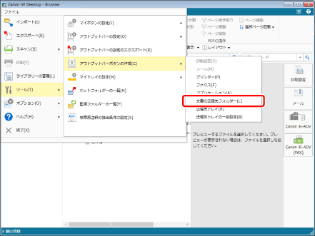 Desktop Editorからも文書の送信先フォルダーを作成できます。Desktop Editorから文書の送信先フォルダーを作成する場合は、[ファイル]メニュー > [登録/管理] > [文書の送信先フォルダーの作成]を選択します。