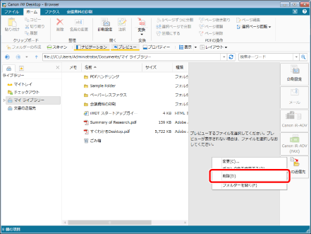 Desktop Editorからも文書の送信先フォルダーを削除できます。Desktop Editorから文書の送信先フォルダーを削除する場合は、[ファイル]メニュー > [登録/管理] > [文書の送信先フォルダーの設定] > (文書の送信先フォルダー名) > [削除]を選択します。
