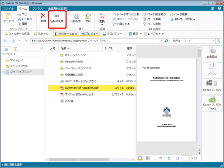 Document Serverライブラリーからチェックアウトした文書の名前を変更した場合、ファイルリストビューウィンドウで名前を変更した文書以外の場所をクリックして選択状態を解除すると、自動的にチェックイン処理が実行されます。