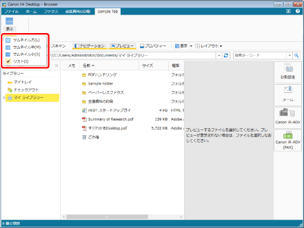 ファイルリストビューウィンドウでは、文書の表示方法をサムネイル表示、またはリスト表示から選択できます。
